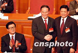 二月二十一日,王岐山(中)在北京市十二屆人大二次會議上以高票當選北京市市長,中共北京市委書記劉淇(右)、市人大委員會主任于均波向王岐山表示祝賀。中新社記者:張宇