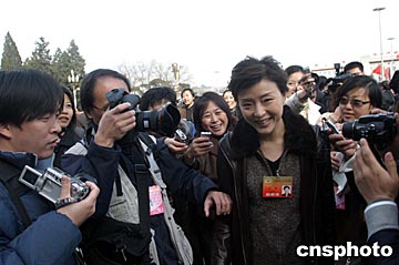 三月三日,全國政協十屆二次會議在北京召開,全國政協委員楊瀾成為記者追逐采訪的對象。中新社記者:張勤
