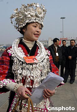 十屆全國人大二次會議十四日在北京閉幕,來自貴州的少數(shù)民族代表盛裝出席閉幕式。中新社記者:張勤