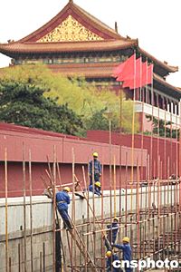 翻建工程擬于明天開工,今年十月一日前竣工。官方希望,天安門觀禮臺(tái)以“嶄新面貌”迎接國慶五十五周年。