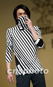 EAGLEPTY休閑裝發布會三月三十一日在北京國際時裝周上舉行,模特展示一款設計簡練卻充滿前衛風格的設計。中新社記者:毛建軍