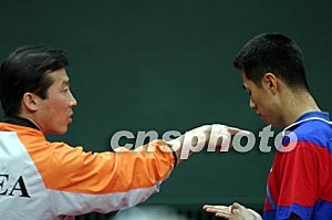 四月十日晚在北京海淀體育館舉行的奧運會乒乓球亞洲區預選賽中,中國小將王皓以4-1戰勝韓國選手朱世赫。圖為金澤洙在場邊為朱世赫進行現場指導。中新社記者:盛佳鵬