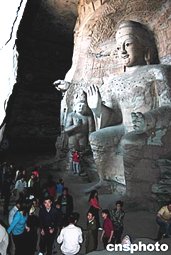 5月8日,游人們在世界文化遺產山西省大同云岡石窟群前游玩。石窟群里雕刻精美的佛像、巧奪天宮的木制建筑和美輪美奐的壁畫,一直吸引著世界各地的游客前來觀光。作者:陳帆