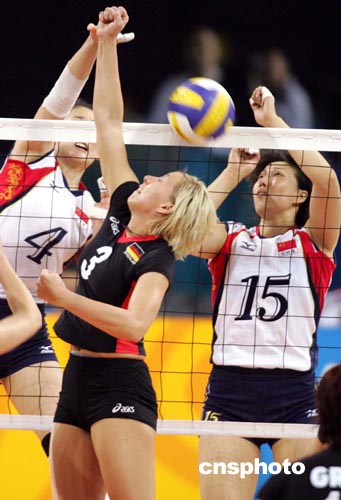 中國女排當?shù)貢r間八月二十日上午在雅典奧運會排球比賽中以三比零戰(zhàn)勝德國隊。中新社記者:毛建軍