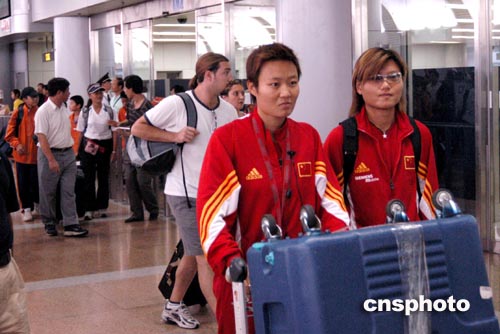 中新社北京八月二十日電(記者高凱)戰(zhàn)敗而回的中國(guó)女足今天從雅典回到北京,盡管飛機(jī)晚到了將近四個(gè)小時(shí),她們?cè)跈C(jī)場(chǎng)依舊受到媒體、足協(xié)和部分球迷的歡迎。