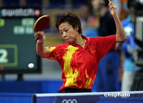 張怡寧面對善于打旋轉(zhuǎn)球的韓國選手金景娥表現(xiàn)得十分冷靜,五局的比分是13:11、11:8、11:5、5:11、11:8。