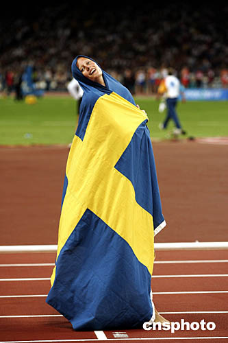 圖為瑞典選手克魯夫特(Kluft Carolina)在獲得女子七項全能冠軍后,身披國旗以示慶祝的畫面。