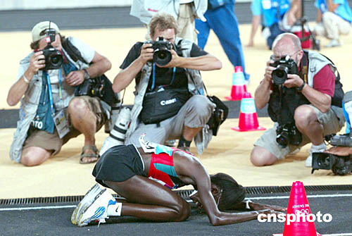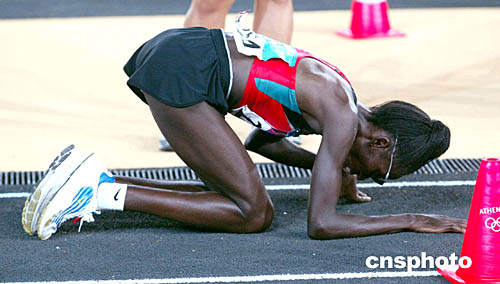 圖為肯尼亞選手恩德雷巴(Catherine Ndereba)在奪得女子馬拉松賽銀牌后跪倒在地呈膜拜的鏡頭。