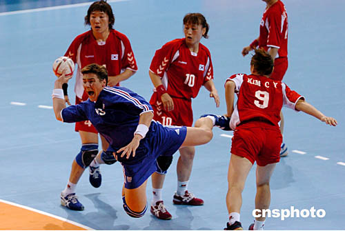 圖為在當地時間8月23日舉行的女子手球比賽中,法國隊的Isabelle Wendling射門的鏡頭