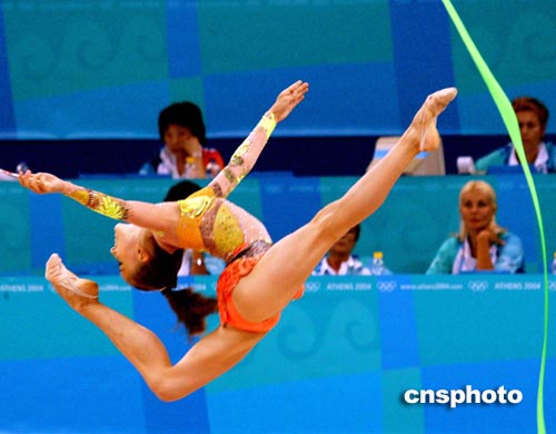 雅典當?shù)貢r間八月二十五日,保加利亞藝術(shù)體操個人全能選手PAISIEVA進行奧運會賽前排練。中新社記者:王瑤