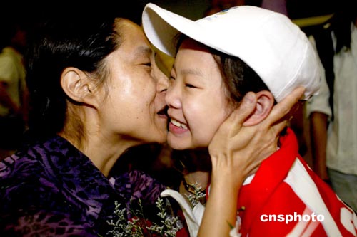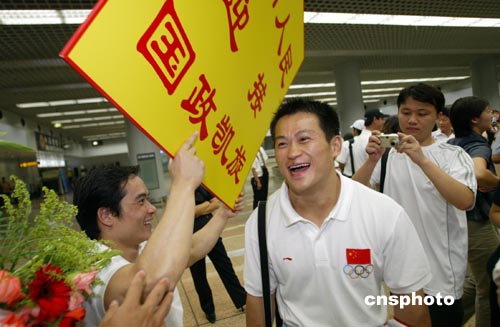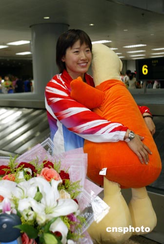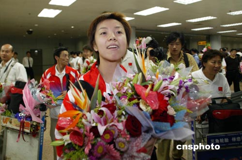 圖為在雅典奧運會沒有獲得獎牌的中國體操小將程菲在機場照樣受到熱烈歡迎與尊敬。