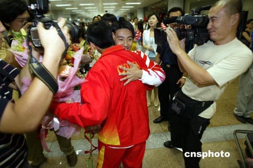 圖為雅典奧運會鞍馬冠軍滕海濱剛出機場即被迎接的隊友擁抱。中新社記者:盛佳鵬