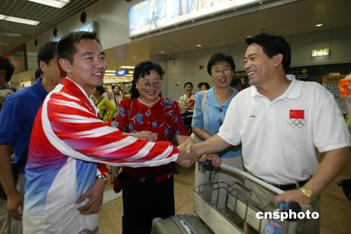 圖為雅典奧運會男子舉重63公斤級冠軍石智勇在機場。