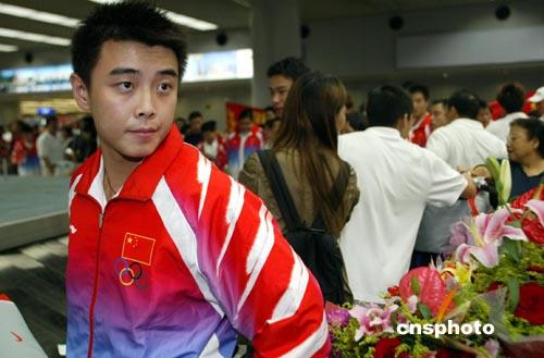 圖為中國乒乓球名將孔令輝在機場與歡迎者笑談雅典奧運。