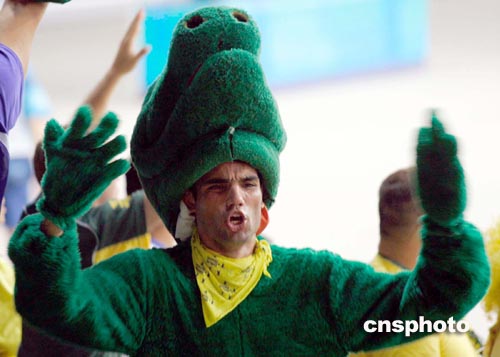 北京時間8月27日凌晨,俄羅斯、巴西女排在雅典奧運(yùn)會女排半決賽中爭奪進(jìn)入決賽的資格。圖為打扮成“大灰狼”的巴西球迷在為本國球隊吶喊助威。中新社記者:張煒