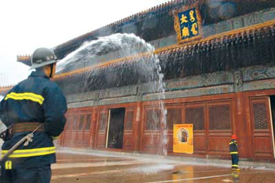 故宮消防中隊出動兩名搶險員,搶救被燒物資,同時府右街消防中隊派出兩副擔架,從殿內(nèi)“火海”中救出兩名“傷員”。花市消防中隊的數(shù)名消防員,在殿內(nèi)架起兩節(jié)梯,從內(nèi)部滅火。