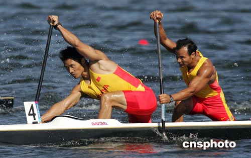 孟關(guān)良/楊文軍在決賽起航階段出現(xiàn)不應(yīng)有的小失誤,最后一個沖出起點,在隨后二百米的較量,兩人奮力追趕,逐漸追到了第四位。
