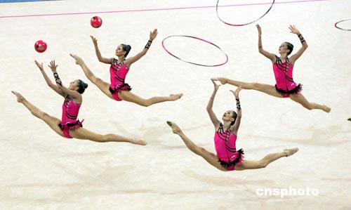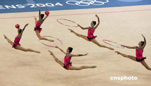 雅典時間8月28日,2004年奧運會藝術體操決賽在雅典舉行,俄羅斯隊以51.100分的最高分奪得冠軍。中新社記者:王瑤