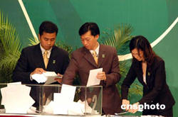 澳門特別行政區第二任行政長官選舉,二十九日在澳門舉行,二百九十九名選舉委員會委員出席選舉會,委員們投票后工作人員在認真點票。作者:梁永強