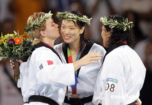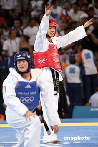 當(dāng)?shù)貢r間八月二十九日,中國選手陳中在雅典奧運(yùn)女子六十七公斤以上級跆拳道決賽中戰(zhàn)勝法國選手獲得冠軍。中新社記者:毛建軍