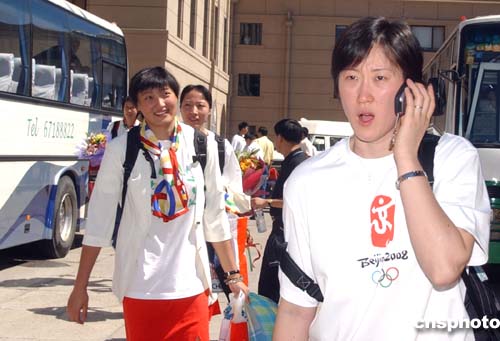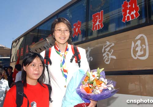 八月三十一日,獲得雅典奧運冠軍的中國女排姑娘們載譽回京,在北京首都國際機場受到各界熱烈歡迎。中新社記者:武仲林