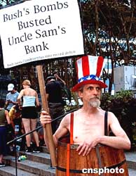 美國公民紐約街頭指責布什。一位抗議者把一只木桶套身上,舉著“布什的炸彈摧毀了山姆大叔的銀行”的抗議標語,批判布什政府發動的反恐戰爭。當日,共和黨大會正在紐約舉行,曼哈頓街頭隨處可見反對布什的標語。作者:趙海燕