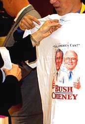 美國共和黨大會當地時間八月三十日至九月二日在紐約舉行,會場里出售的印有布什和切尼肖像的文化衫成為搶手貨。作者:趙海燕