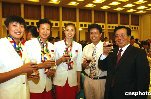 中共中央政治局常委李長春向獲得奧運(yùn)冠軍的中國女排祝酒。中新社記者:武仲林