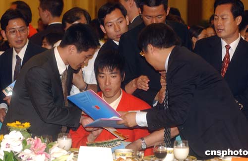 九月二日晚,中共中央辦公廳、國務院辦公廳在北京人民大會堂宴會廳舉行招待會,歡迎載譽歸來的第28屆奧運會中國體育代表團。圖為110米欄奧運冠軍劉翔招待會上被眾多的體育迷包圍獲取簽名。中新社記者:武仲林