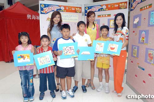 應屆港姐徐子珊、朱慧敏及符思思9月11日在香港出席TVB兒童節心意卡及短文比賽頒獎典禮。三位港姐與TVB兒童節心意卡設計獲獎的小朋友合照。作者:鄧慶樂