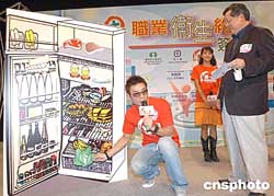 歌星許志安9月23日在香港出席由職業安全健康局、勞工處及香港電臺聯合舉辦「精靈一點---職業衛生約章簽署儀式」記者會,助理廣播處長邵盧善向「職安健大使」許志安頒贈紀記品。作者:鄧慶樂