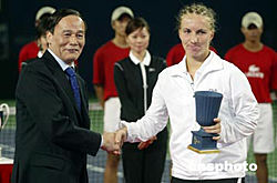 九月二十六日晚,中國網(wǎng)球公開賽女子單打決賽在北京網(wǎng)球中心中央球場(chǎng)進(jìn)行,美網(wǎng)新后、俄羅斯名將庫茲涅佐娃一比二不敵賽會(huì)頭號(hào)種子選手、美國網(wǎng)壇名將小威廉姆斯,屈居亞軍。圖為比賽結(jié)束后北京市長(zhǎng)王岐山(左)為庫茲涅佐娃頒發(fā)亞軍獎(jiǎng)杯。中新社記者:盛佳鵬