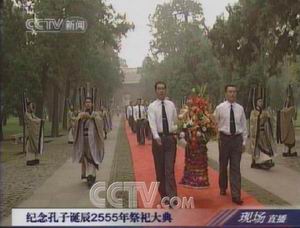 曲阜市常務(wù)副市長(zhǎng)袁炳新主持了首次官方祭祀大典,曲阜市市長(zhǎng)江成誦讀了祭祀祭文。祭文每句四字共二百九十六句,歷數(shù)至圣先師之功德,敘述后世繼承之作為,展望中華崛起之宏圖,表達(dá)期盼大同和平之愿望。隨后,曲阜市人大、市政府、市政協(xié)等敬獻(xiàn)了花籃,市人大主任盧兆河、市長(zhǎng)江成率政府各部門官員祭拜了孔子。
