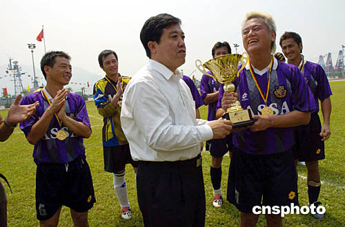 圖為外交部駐港特派員楊文昌向明星隊頒發冠軍獎杯。