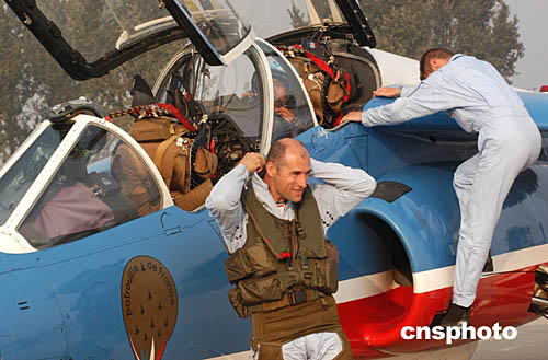 “法蘭西巡邏兵”飛行表演隊的法國飛行員們,十月五日下午四點四十分許飛抵北京南苑機場,他們充滿喜悅地接受了北京新聞媒體記者的采訪,并和年輕的女記者合影留念。