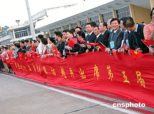 十月六日傍晚,中國總理溫家寶抵達(dá)河內(nèi)開始對(duì)越南正式訪問。中國駐越使館工作人員、華僑、留學(xué)生手持國旗,打出橫幅熱烈歡迎溫家寶總理訪問越南。作者:吳慶才