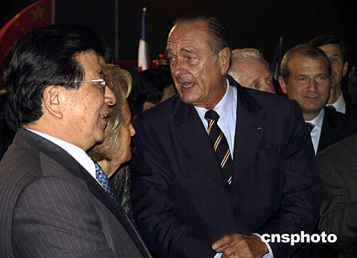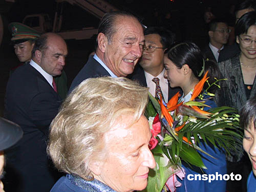 法蘭西共和國總統雅克·希拉克一行于八日晚22時抵達訪華首站--四川省成都市,在雙流國際機場,受到了中國國家副主席曾慶紅、中共四川省委書記張學忠等官員的熱烈歡迎。希拉克總統應中國國家主席胡錦濤邀請,來華進行為期五天的國事訪問。作者:楊杰