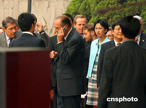十月十一日,法國總統(tǒng)希拉克訪問上海,圖為他在繁忙的行程中接聽手機(jī)。作者:潘索菲