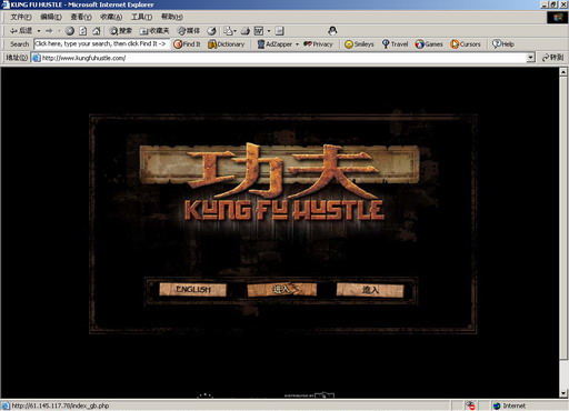 昨日,記者提前進(jìn)入網(wǎng)站,看到了非常搞笑的預(yù)告片片斷———周星馳在豬籠城寨被拿蔥的大嬸痛打一拳。《功夫》英文名為《Kung Fu Hustle》,官方網(wǎng)站為,網(wǎng)站使用三種文字:英語、中文簡體和中文繁體。網(wǎng)站上除了有電影簡介、演員檔案等內(nèi)容外,還有兩個最新的FLASH游戲“豬籠城寨大亂”和“斧頭幫暴亂”,登記為斧頭幫會員的網(wǎng)友可比賽積分,此后還會加入兩個新游戲“冰淇淋狂熱”和“功夫戰(zhàn)士”。