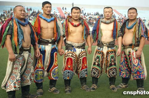 按蒙古族傳統,摔跤手上身穿牛皮或帆布制成的“著德格”袖臂蓋背,邊沿鑲有銅釘或銀釘。腰系“來布爾”(即圍巾),下身穿肥大“班斯勒”(即摔跤褲),是用三十二尺或十六尺白布制作的專用摔跤褲,外套有花色的套褲,腳蹬蒙古靴或馬靴。頸套五色綢穗制成的“景嘎”,標志著獲勝次數,名次越多,彩條依次增加。