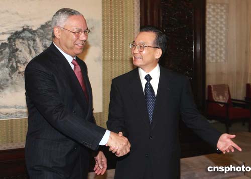 鮑威爾表示,很高興再次訪問北京。他對(duì)溫家寶訪問美國記憶猶新。在那次訪問期間,布什總統(tǒng)重新確認(rèn)了一個(gè)中國的政策。