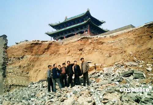 中新網10月27日電 媒體報道,昨日,山西平遙古城墻的修復工作開始。城墻邊上的腳手架已經開始建立,平遙文物局的工作人員已經開始對城墻的基礎開始進行測量,同時,部分施工人員也于26日來到工地。
