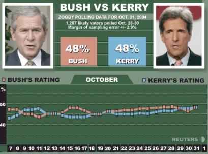 而路透/佐格比(Zogby)上周日公布的最新民調(diào)顯示,布什和克里再度打成平手。布什和克里在這項三天的全國追蹤民調(diào)中,均獲得48%的支持率,三天當中有一天是在播出奧薩馬錄影帶后進行調(diào)查。此前,克里在上周六的調(diào)查中以47%比46%,領(lǐng)先布什1個百分點。目前只有2%的選民尚未做出最后決定。