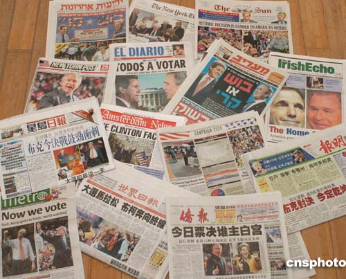 二○○四年十一月二日是美國大選日。當天紐約報攤上的英文、中文和其他少數族裔語種報紙,一律聚焦總統選舉。作者:龔文謨