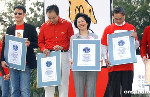 香港前政務司司長陳方安生、愛心大使黎明、麥當勞有限公司董事總經理劉士盛等嘉賓,在香港維園出席“麥當勞世界兒童日2004”千人愛心跳繩,締造最多人跳繩的健力士世界紀錄。作者:洪少葵