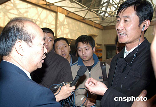 11月24日中午,11.21空難事故調(diào)查組在包頭賓館舉行發(fā)布會(huì)后,一名遇難者生前摯友(右)向調(diào)查組官員詢問事故調(diào)查進(jìn)展以及善后處理情況。中新社記者:張宇