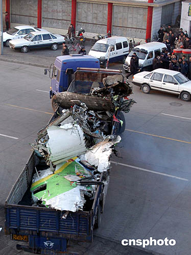 11月22日下午,11.21包頭空難事故現場打撈上的大塊飛機殘骸裝上貨車運離,機殼圖案清晰可見。中新社記者:張宇