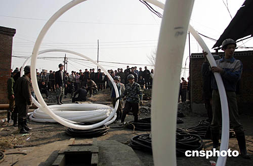 十一月二十三日,“11.20”河北省沙河礦難救援工作仍在進行,救援人員向井下運送水管以排干被水淹沒的巷道。截止當日中午,遇難礦工人數(shù)已達五十七人,另有八人下落不明。據(jù)有關(guān)方面透露,被困礦工人數(shù)仍有可能增加。中新社記者:武仲林