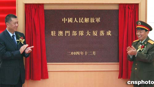 三日,解放軍駐澳部隊為新建的「駐澳門部隊大廈」舉行落成典禮,澳門特首何厚鏵、廣州軍區副政委張國初中將為新的指揮大樓揭幕。作者:梁永強