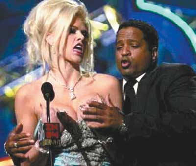 VH1音樂頻道2004頒獎晚會日前在洛杉磯舉行,安娜·尼科爾·史密斯也應邀參加,不知為何,當她走到舞臺上后,突然脫去了裙子,露出了自己的雙乳,及時趕到的保安用手盡量遮擋住她的乳房,強行將她拉到了后臺。據一位觀眾說:“當時,史密斯看起來非常興奮,就在她脫裙子的一瞬間,一名保安把她拉到了后臺。”可是,到了后臺后史密斯仍然不老實,她甚至想讓攝影師給她拍裸照。前不久,史密斯在參加美國音樂頒獎晚會時,也因精神恍惚、吐字不清令觀眾無法聽懂她在說什么,還一度趴在臺上睡覺,結果主持人打斷了她的講話,將她請下舞臺。有消息說,她當時要么是喝醉了,要么就是受到了吸毒的影響,但她的律師解釋說,由于這位名模的視力不太好,所以無法看清自動提詞機上的文字。